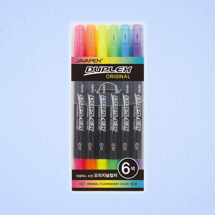 듀플렉스 오리지널 형광펜 6본입 세트 할증 : 5타스+, 5+1 상품번호 : 4866 로그인후 확인가능 케이스 친환경 PP케이스잉크컬러 고급안료잉크 분홍, 주황, 노랑, 연두, 하늘, 보라닙 굵기 4.0mm / 1.0mm 원산지 한국 제조사 (주)자바펜 수량선택(타) − +